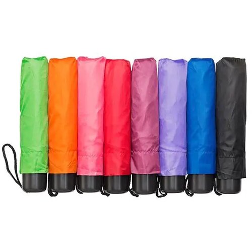 opvouwbare paraplu, 3-delig, metalen stok en frame, zwart kunststof handvat, met foedraal, wisselende kleuren, uitsluitend assorti verpakt. 4 black 2 blue 6 mixed colours Lengte 24 cm. Diameter 90 cm. Aantal panelen 8. Materiaal polyester.