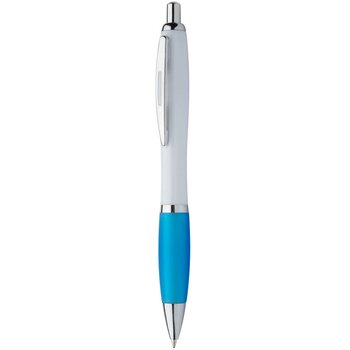 Kunststof balpen met witte houder, gekleurde grip en glanzend chromen onderdelen. Blauw schrijvend.