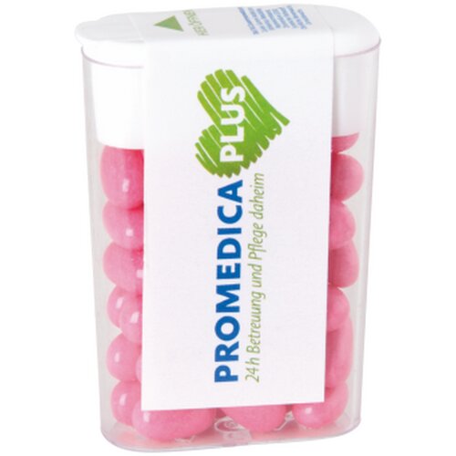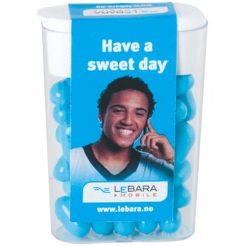 De Tak-Tik snoepjes in dispenser zijn een leuke en praktische manier om je merk te promoten. De dispenser heeft een compact formaat van 60 x 40 x 15 mm en bevat 20 gram Tak-Tik snoepjes. De Tak-Tik snoepjes zijn verpakt in een dispenser met een full colour label, waarmee je jouw logo of boodschap perfect kunt presenteren. Het kleurrijke label biedt veel ruimte voor een opvallende bedrukking. De Tak-Tik snoepjes in dispenser zijn ideaal als relatiegeschenk of promotiemateriaal. Verhoog de zichtbaarheid van je merk met dit aantrekkelijke en smakelijke geschenk!