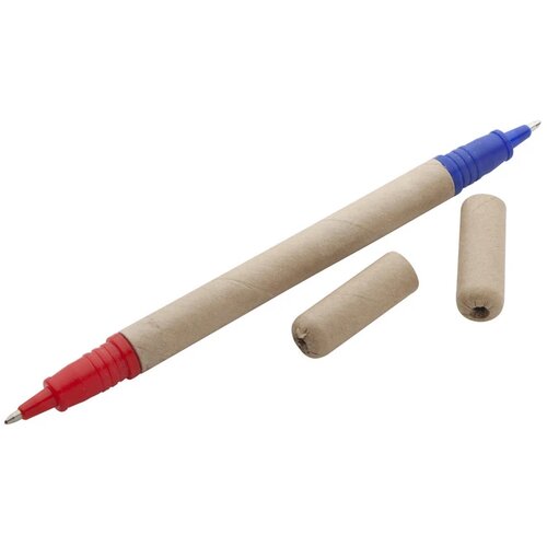 Gerecyclede papieren balpen met twee einden. Blauw- en roodschrijvend.