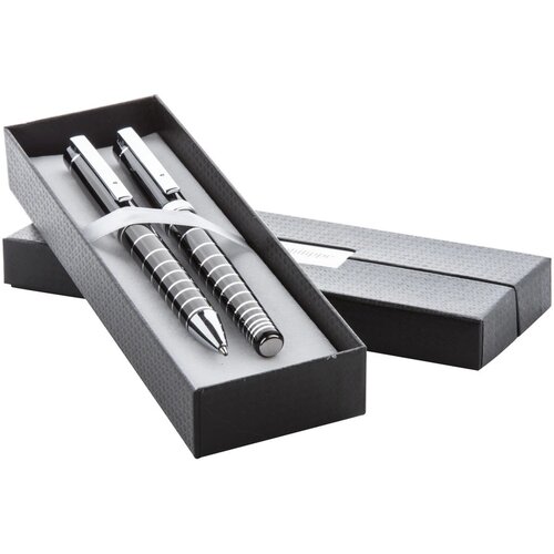André Philippe. Moderne aluminium pennenset met een balpen en een rollerpen. Met glimmende punt en aluminium decoratie in zwarte geschenkverpakking. Blauw schrijvend.