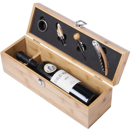 Bamboe wijn set met kurkendraaier, druppel stopper, plug en schenktuit. In bamboe doos met compartiment voor een wijnfles. Fles niet meegeleverd.