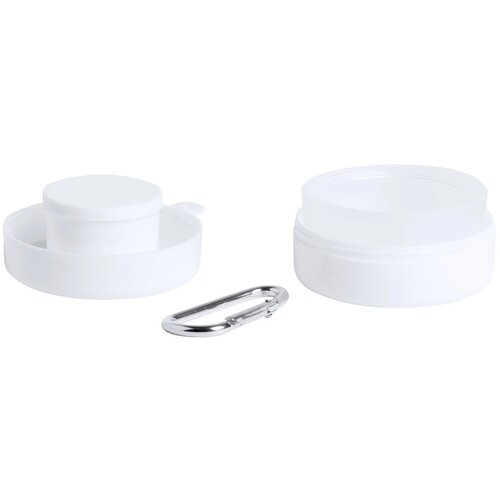 Plastic opvouwbare beker met compartimenten voor pillendoosjes, in geval van karabijnhaak. Inhoud: 220 ml.