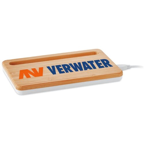 Het Draadloos Oplaadstation Kerala is een elegante en functionele oplader met een bamboe toplaag. Dit station biedt zowel draadloos opladen (DC5V/1A, 5W) als een USB-hub met een output van DC5V/1A, perfect voor de nieuwste Android- en iPhone-modellen (iPhone 8® en nieuwer). Het komt met een Type C-kabel en een handige smartphonehouder. Bamboe is een natuurlijk materiaal, waardoor de kleur per item kan variëren, wat elk product uniek maakt. Wil je je merk op een stijlvolle manier promoten? Je kunt deze draadloze opladers bedrukken of graveren op de bovenzijde, bijvoorbeeld met je logo of naam. Daarmee is het ideale keuze voor een gepersonaliseerd relatiegeschenk!