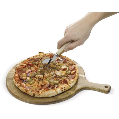 De Houten pizzaplank met pizzasnijder is een stevige en stijlvolle serveerplank van acaciahout. Met een diameter van 36 cm is de plank ideaal voor het serveren van je favoriete pizza's. De set wordt geleverd met een bijpassende pizzasnijder, zodat je de pizza gemakkelijk kunt snijden. Zowel de pizzaplank als de pizzasnijder kunnen worden gegraveerd met een logo of tekst. Pizzasnijders laten bedrukken is een uitstekende manier om dit relatiegeschenk persoonlijk te maken. De Houten pizzaplank met pizzasnijder wordt geleverd in een luxe geschenkverpakking. Perfect voor een geschenk of promotieactie!