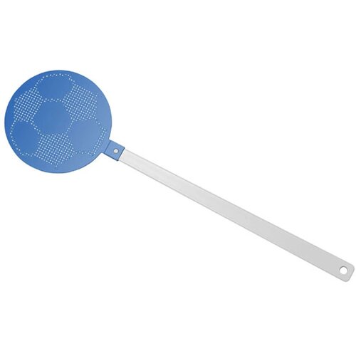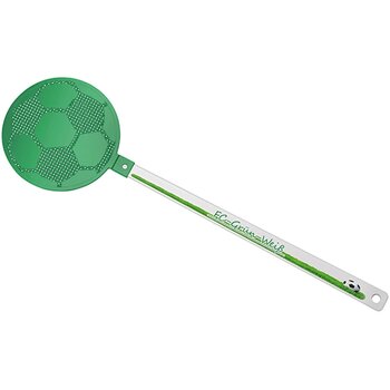 Deze vliegenmepper in de vorm van een voetbal is een must-have voor elke voetbalfan. Handig met een oogje in het handvat om gemakkelijk op te hangen. Gemaakt van stevig kunststof en met een afmeting van 42 x 12 cm. Verkrijgbaar in verschillende kleurcombinaties, zoals een rood blad met een wit handvat. Op het handvat is er ruimte voor een bedrukking over de gehele lengte. Laat vliegenmeppers bedrukken en zet jouw merk of boodschap in de schijnwerpers.
