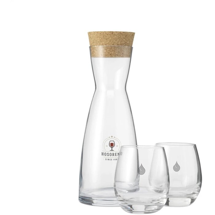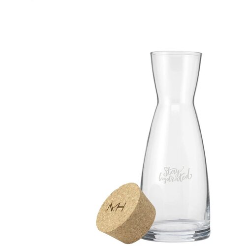 Sierlijke, glazen karaf met een dop van kurk. Een tafelfles voor het serveren van water, sap of alcoholische dranken. Met royale opening voor het toevoegen van ijsklontjes. Gemakkelijk te reinigen. Inhoud 1.000 ml. De dop wordt los geleverd.