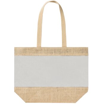 Gekleurde strandtas in combinatie van gelamineerd jute en gelamineerd katoen met lange hengsels.