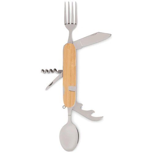 De multitool zakmes met bestekset is een metalen, multifunctionele tool in een houten behuizing. Afmetingen: 11x3,7x3 cm. Deze compacte set bevat een vork, lepel, mes, blikopener en wijnopener, verdeeld over twee afneembare delen. Alle functies vouw je netjes op in het houten omhulsel. Door het natuurlijke hout kunnen kleur en grootte per product verschillen. Je kunt het handvat laten bedrukken of graveren met jouw ontwerp, ideaal voor kamperen of backpacken.