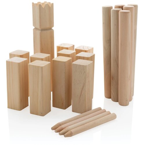 Kubb is van oorsprong een Zweeds werpspel, maar is snel populair en bekend geworden over de hele wereld. Een perfecte manier om een zomerse middag door te brengen met vrienden. Het doel is om de 'Ridders' van de andere teams omver te werpen door de ronde werpstokken van een paar meter afstand onder arms te gooien. Gebruik gewoon de houten hoekpalen om je speelveld af te bakenen en het spelen kan beginnen! De set bevat 1 koning, 6 werpstokken, 10 ridders en 4 hoekstokken. Gemaakt van grenenhout (koning en ridders) en eucalyptushout (werpstokken en hoekpalen) Inclusief katoenen etui en spelregels.