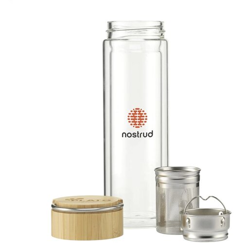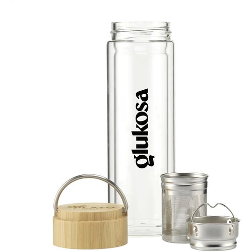 De Bamboe waterfles met infuser (300 ml) is een stijlvolle en duurzame keuze voor iedere theeliefhebber. De fles is dubbelwandig en gemaakt van helder borosilicaatglas, wat zorgt voor extra stevigheid. Hij wordt geleverd met een roestvrijstalen infuser en theezeef, zodat je jouw favoriete losse thee overal kunt zetten. De bamboe schroefdop heeft een stevige roestvrijstalen draagbeugel en is 100% lekvrij. De Bamboe waterfles met infuser (300 ml) kan rondom bedrukt worden of kies voor een gravure op de dop. Onze waterflessen met logo zijn perfect als persoonlijk relatiegeschenk voor elke gelegenheid!