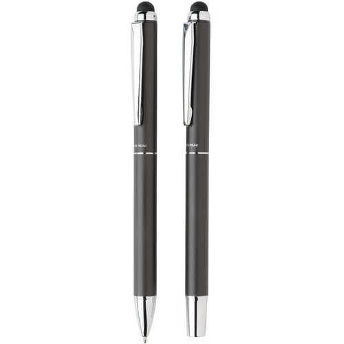 Deze Swiss Peak deluxe pennenset bevat een balpen en een rollerbal voor de totale schrijfervaring. Beide items in deze geschenkset zijn gemaakt met hoogwaardige aluminium en een prachtige matte anthracietkleurige afwerking. Elke pen bevat blauw gekleurde Dokumental-inkt. De schrijflengte voor de pen is 1200 meter en de rollerbal is 400 meter. De pennenset wordt geleverd in een luxe PU etui en zwarte geschenkverpakking.