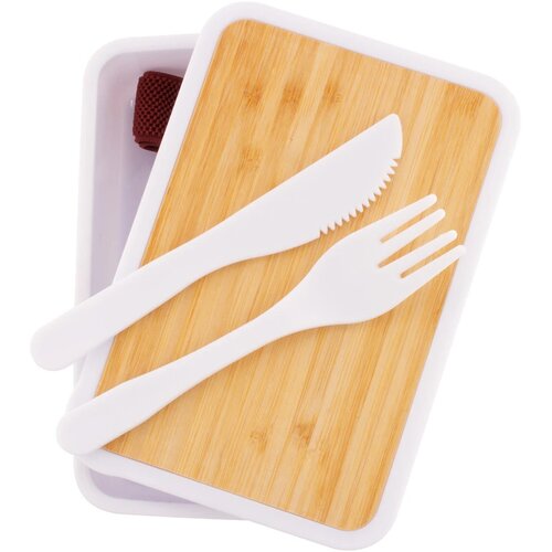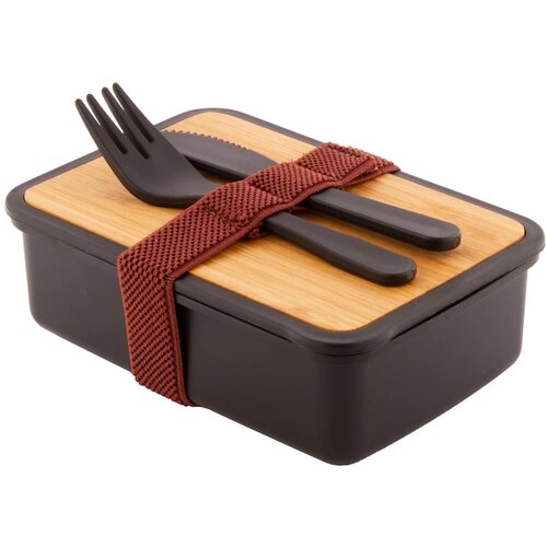 Lunchbox van gerecycled PP plastic met deksel van bamboe, bestekset (mes en vork) en elastische band. 500 ml.