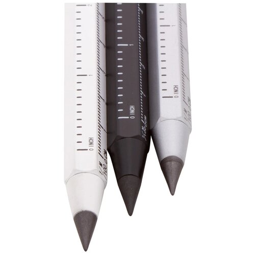 Inktloze pen met liniaal gemaakt van gerecycled aluminium. De pen schrijft zonder inkt door het papier te oxideren en is uitwisbaar. Met een zeshoekige houder waarin een liniaal van 11 cm en 4 inch is verwerkt. De pen is leverbaar in zilver, wit en zwart. Je kunt de voor- en achterkant van de inktloze pen met liniaal bedrukken of graveren met jouw eigen ontwerp.