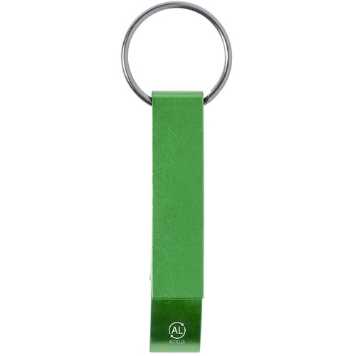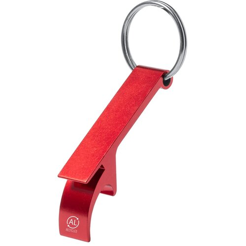 Fles- en blikopener van gerecycled aluminium met metalen sleutelhanger.