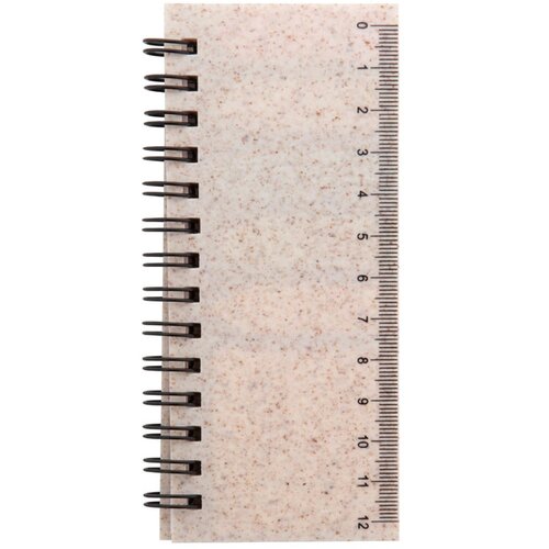 Ecologisch, met tarwestro bedekt spiraalvormig notitieboek met 40 gelinieerde vellen gerecycled papier, 25 stickynotes en 125 paginamarkers (in 5 verschillende kleuren). Met 12 cm liniaal op de kaft.