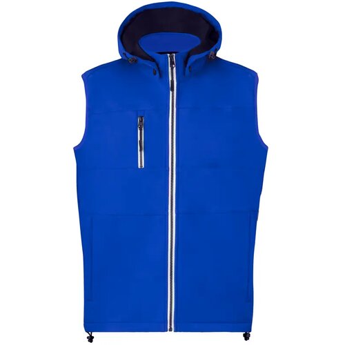 Wind- en waterdicht softshell bodywarmervest met ritssluiting, 2 zijzakken, 1 voorzak, opstaande kraag en afneembare capuchon. 100% polyester, 300 g/m².