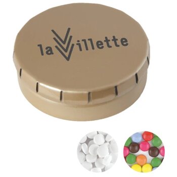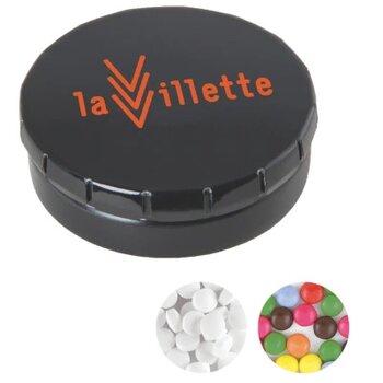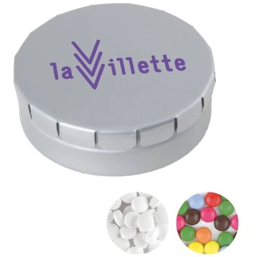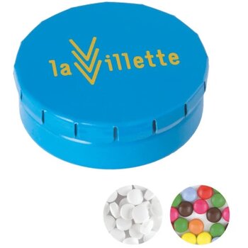 Het ronde click clack snoepblikje is ideaal als promotiemateriaal. Het metalen blikje (Ø 45 mm x 15 mm) bevat ca. 12 gram mintjes. Kies uit 13 kleuren, zoals paars, groen en geel. Het blikje kan gevuld worden met diverse lekkernijen. Laat het deksel bedrukken met jouw logo of boodschap. Perfect om jouw merk te promoten op een smakelijke manier. Met ons snoep met logo maak je gegarandeerd indruk op jouw relaties!