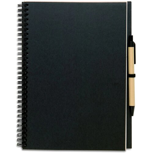 Notitieboek met 140 blanco pagina's (70 vellen) gerecycled papier, inclusief biologisch afbreekbare en gerecyclede balpen. Blauwe inkt.