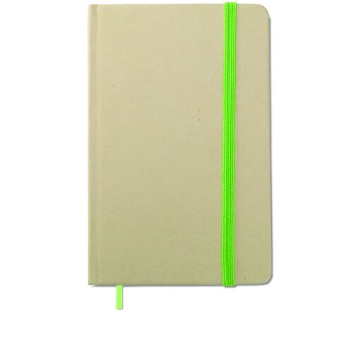 A6 notitieboekje van gerecycled materiaal, met bijpassend gekleurd bladwijzer en een elastieken sluiting. 192 blanke pagina's (96 vellen).