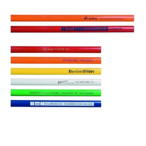 Ongeslepen timmermanspotlood met een lengte van 18 cm of 24 cm. Het timmermanspotlood is leverbaar in de kleuren geel, rood, blauw, oranje, groen en wit. Een kleurrijk relatiegeschenk voor in de bouw. Wanneer u opzoek bent naar een goed potlood dan is dit de juiste keuze. De prijs is inclusief het bedrukken van uw tekst in standaard letters d.m.v. indruk/foliedruk in 1 kleur op 1 zijde. De opdruk wordt in het hout geperst, zodat dit slijtvast is.