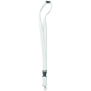 Lanyard van polyester met metalen mini karabijnhaak en veiligheidssluiting. Het onderste gedeelte kan losgeklikt worden d.m.v. een kunststof clip. Breed: 20 mm.