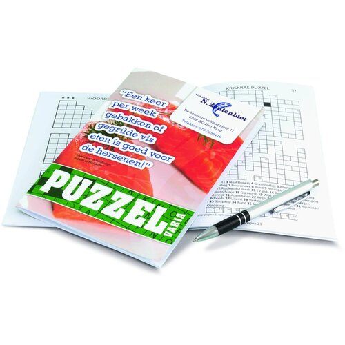 Puzzelplezier voor iedereen! Dit puzzelboekje bevat 44 verschillende puzzels, zoals woordzoekers, kruiswoordraadsels en woordtrapjes. Het boekje is compact en makkelijk mee te nemen (148x210mm). De stevige omslag wordt geheel naar wens bedrukt in full-colour. Jouw ontwerp komt prachtig tot zijn recht op dit handzame formaat. Verras klanten of medewerkers met een uniek bedrukt puzzelboekje dat garant staat voor ontspanning en vermaak. Perfect als origineel relatiegeschenk of voor op vakantie.