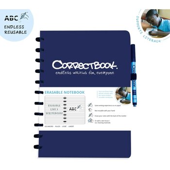 Uitwisbaar A4 (297mm bij 210mm) notitieboek met 40 uitwisbare pagina's. Bij elk correctbook wordt een sponsje meegeleverd en bij elk correctbook zit een pen en pen lus inbegrepen. Het is eventueel ook mogelijk om de voor en de achterkaft te bedrukken in full colour. De levertijd is ca. 3 weken.