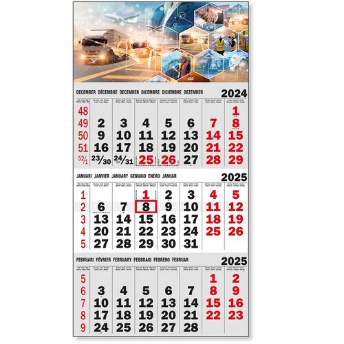 De 3-maandskalender voor aan de wand heeft 12 maandbladen die je eenvoudig kunt afscheuren. Uitvoering in 6 talen (F-NL-GB-D-IT-ES). Met de schuifregelaar geef je de juiste datum aan. Voorzien van een oog om op te hangen. Het formaat is 305 x 628 mm, met een kopstrook van 305 x 150 mm die je kunt bedrukken met jouw reclame. De 3-maandskalender voor aan de wand is ideaal voor overzicht in huis of op kantoor.